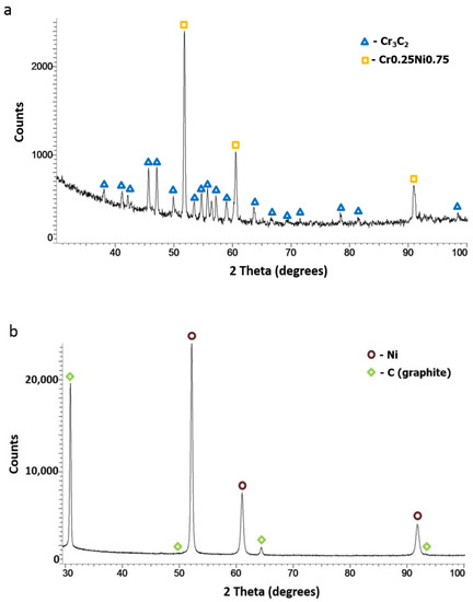 Based on the phase analysis, it can be concluded that Diamalloy 3004 powder consists of a Cr3C2 phase (orthorhombic, a = 5.5329 Å, b = 2.82900 Å, c = 11.4719 Å, Space Group: Pnma (62)) and a Ni-Cr cubic phase with the lattice parameter (a = 3.547 Å) close to that of the Cr0.25Ni0.75 phase (cubic, a = 3.552 Å, Space Group: Fm-3m (225)) (Figure 4a). The phase analysis of the Ni-25Graphite powder showed that it consists only of pure nickel (cubic, a = 3.529 Å, Space Group: Fm-3m (225)) and graphite (hexagonal, a = 2.461 Å, c = 6.708 Å, Space Group: P63mc (186)) (Figure 4b).