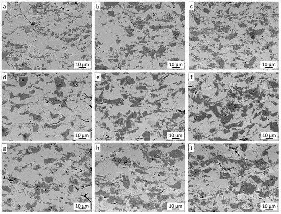 The dominant light grey phase is the matrix of the coating, which consists of highly deformed Ni20Cr alloy grains. The dark grey phase is chromium carbide, the grains of which, when they hit the substrate at high speed, are crushed and then jammed in the substrate and the matrix [28,30,31]. It can be observed that the size of these grains is much smaller than in the sprayed powder. This is because they do not have the ability to deform and most of them crumble into smaller grains when hitting the substrate. The plastic Ni20Cr matrix enables the deposition of carbide grains in it. Such cracked and embedded Cr3C2 grains are clearly visible for each case of the coating spraying parameters of the Taguchi experiment (Figure 5). When a Cr3C2 grain impacts the Cr3C2 grain already embedded in the coating, it is crushed and reflected from the Cr3C2 grain surface, additionally causing its partial knockout from the Ni20Cr matrix. The black phase visible in the cross-sections is graphite, which is the third component of the coating. Graphite grains covered with a thin layer of nickel deform when they hit the substrate and they deposit. Graphite is a soft material and its grains are easily deformed due to the loose interlamellar coupling between sheets in the crystal structure. It can be assumed that the Ni20Cr and Cr3C2 alloy powders hitting the surface successively cause further deformation of the deposited Ni-graphite grains, breaking its nickel shield and, at the same time, closing the graphite in the resulting voids and removing it from the coating surface. During the spraying process of coatings with the addition of graphite, a significant increase in dustiness was visible. The presence of graphite is clearly visible in the cross-section of coatings deposited in the frame of the conducted Taguchi experiment. It is located both in the voids between the deformed Ni20Cr alloy grains, on the interface between Ni20Cr and Cr3C2, and inside the cracked chromium carbide grains.