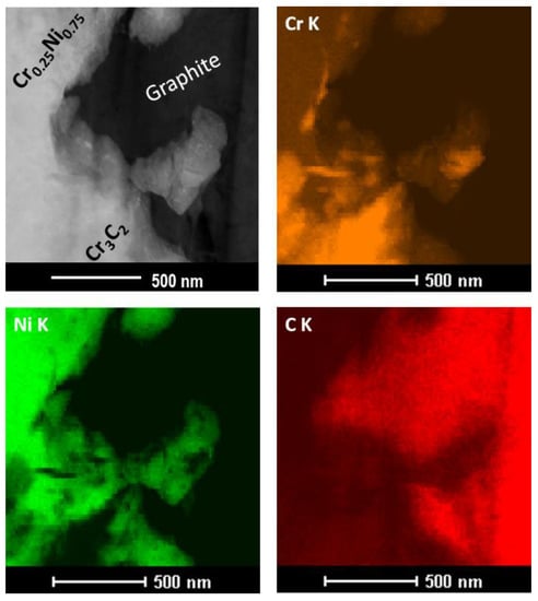 The analysis of the coating microstructure made in TEM Bright Field mode confirmed that the graphite fills all spaces, even of a nanometric size, both in contact with the Ni20Cr matrix and the Cr3C2 grain (Figure 9a). The STEM microstructure also shows a very good connection of the Ni20Cr matrix with the Cr3C2 grain (Figure 9b).