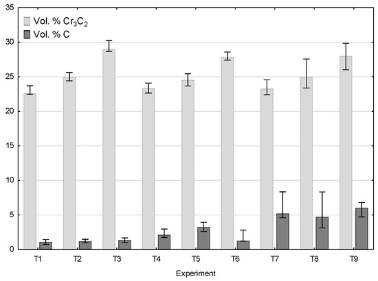 Some of the ceramic grains cracked when hitting the plastic substrate, and such cracked grains are found in the cross-sections of the coatings (Figure 5). Graphite is visible in the spaces between the deformed grains of the Ni20Cr powder and the chromium carbide grains. The addition of nickel-coated graphite grains in the sprayed mixture makes the surface free from pores present on the surface of coatings deposited without its addition [30,33]. For all sprayed coatings in the frame of the Taguchi experiment, quantitative image analysis was used to calculate the amount of reinforcing Cr3C2 carbide phase and the amount of graphite responsible for the frictional properties of the coating (Figure 11).