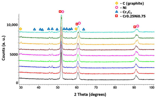 In each case, the amount of both Cr3C2 and graphite varied. As the graphite content in the powder mixture increased from 5 to 10 wt.%, the proportion of chromium carbide lowered. Figure 12 presents a phase analysis of the coatings sprayed with cold gas as part of the Taguchi experiment. No new phase appeared in the coatings and the phase composition of all coatings was the same as the composition of the powders from which the spray mixture was made (Figure 4). All coatings were sprayed at the maximum temperature achievable by the system of 800 °C at various parameters (Table 1). Neither the change of the distance (20–40 mm) nor the change of the gas mixture composition (N2, He) and the addition of graphite in the nickel shell resulted in the appearance of a new phase in the coating.