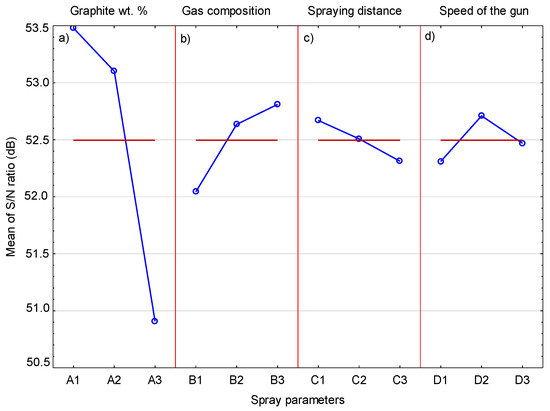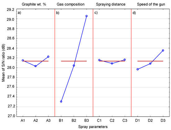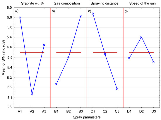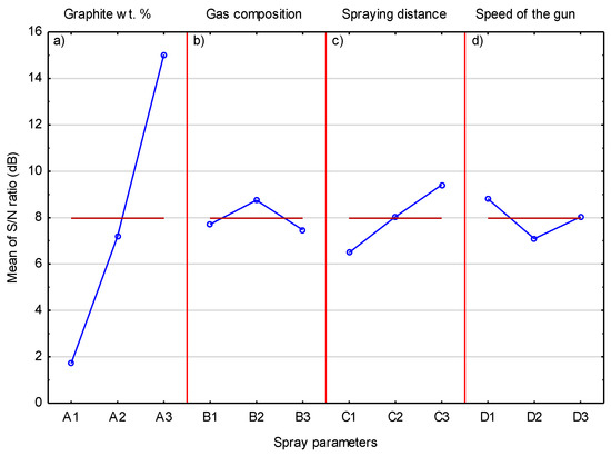 Figure 14 shows the mean S/N response plot for the graphite content in the coating. The influence of the graphite content in the sprayed mixture is clearly visible and confirms that the mixture with the highest graphite content allows the coating with the highest graphite coating to be deposited. To a much lesser extent, an increase in the spray distance also has an effect on the graphite content inside the coating. It can be assumed that much larger graphite grains achieve lower speeds, which are further lowered by the increased spray distance. This leads to less deformation of graphite grains and keeping them in the coating. If the graphite grain hits the surface with high speed, then the nickel shell breaks and the graphite without this cover is exposed to impacts of hard Cr3C2 and Ni20Cr grains, which remove it from the surface of the coating.