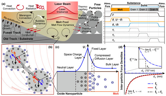 (a) Schematic of interactive physical phenomena during a stable LPBF process (left) and the order parameter profiles of the phase-field model (right); (b) force analysis of two oxide nanoparticles (labeled as i and j) in the melt pool with streamline and charges denoted; (c) schematic of charge distribution and potential profile across the oxide-melt interface based on explanations in [49]; (d) variation of the inter-particle force densities to the surface distance.