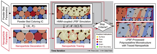 Assuming negligible counter-effect of the nanoparticles on the melt flow, the simulation is designed in a subsequent scheme: an HMM-coupled phase-field simulation for the LPBF process and a subsequent nanoparticle kinematics simulation with information received from the phase-field simulation, as shown in Figure 2. The information includes the initial condition (IC) of the powder bed as a set with the center and the radius of the powder I to create IC (centers and radii) for the additivated nanoparticles, and nodal values ( and of nodal J) of every time-step to provide the melt-flow driving force as well as the on-site phase information. Due to the infinitesimal-volume assumption, the drifted nanoparticles are represented and traced by corresponding center position . The trajectories of the nanoparticles are then calculated numerically by discretizing the kinematic model outlined in Section 2.2 in the backward differences fashion: