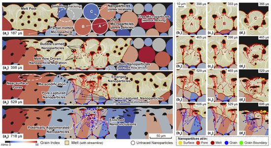 - Simulation results provide the chronological location and located phases of the traced nanoparticle. This helps to depict nanoparticle drift associated with the evolution of local melt flow as well as the morphology, such as migrating nanoparticles driven by melt-flow or carried by floating/deforming bubbles, or stationary ones in the melt pool bottom area. Events such as nanoparticle capture (by grain/pore/grain boundary), enrichment, and potential agglomeration can be also visualized via trajectories and position indicator.