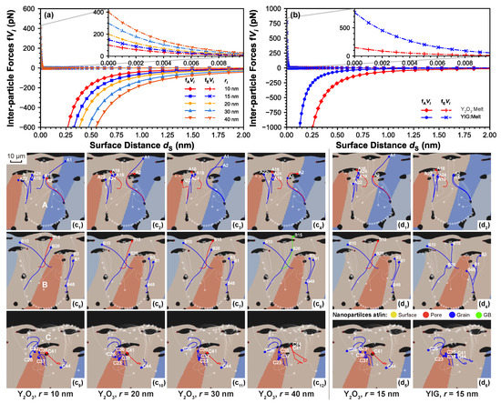 Figure 4a,b presents the interactive forces vs. surface distance between two nanoparticles with different radii and composition, which are and YIG, their properties and related coefficients are listed in Table 3. Notice here the Hamaker coefficients in the melt for both and YIG are calculated according to Equation (8b) using the coefficients in vacuum for both compositions and the melt, where is calculated by Equation (8c). It can be observed that, for the same surface distance, increasing nanoparticle radius leads to a higher VDW attraction as well as electrostatic repulsion. Comparing nanoparticles of the same size but different composition, YIG nanoparticles present less VDW attraction and more electrostatic repulsion compared to ones. Nevertheless, the interaction range of the electrostatic repulsion is limited to the scale, and this interaction highly decreases in the nanoscale due to strong screening effects from background free electrons (reflected by very small ), where the VDW attraction still takes the major role. This fact explains the instability of homogeneously dispersed nanoparticles on the 10 scale, as explained in Section 2.2. In the case of VDW attraction, it presents a considerable decay when , hence its influence over the inter-nanoparticle attractions is low, especially when the nanoparticles are sparsely distributed. Therefore, melt-flow-driven effects are the dominant mechanism, and the effects from nanoparticles’ size (radius) and density would be significant.