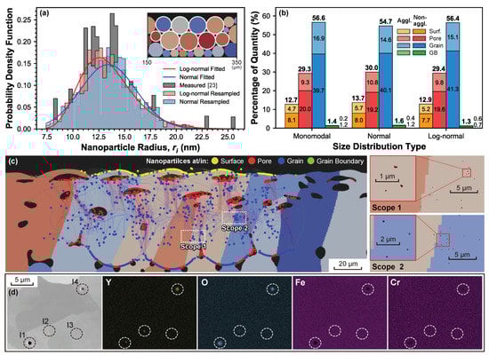 (a) Size distributions of nanoparticles. Inset: selected parent particles. (b) Statistics of drift destinations of nanoparticles with respect to distinct size distributions, presented as the percentage of quantity to the total amount of decorated nanoparticles, i.e., , with the ones of agglomerated/non-agglomerated nanoparticles also presented as the component for each destination genre; (c) dispersion of traced nanoparticles with the log-normal size distribution in the LPBF-processed PM2000 polycrystal matrix (left) and regional magnification of dispersed nanoparticles in selected scopes (Scope 1 and 2) in realistic scale (right). Magnified scopes are employed to distinguish the occurrence of agglomeration from the enrichment, which is inaccessible in the trajectory illustration on the left. (d) SEM backscatter electron imaging with the corresponding EDX maps of the elemental Y, O, Fe, and Cr content in four inclusions (I1-I4) for identifying nanoparticle agglomeration. I3 is not agglomerated nanoparticles due to a lack of Y content, while I1 implies agglomerated nanoparticles on the surface of another oxide inclusion. The magnified scope in (c) right is also compared to the SEM imaging in (d), demonstrating relatively larger nanoparticle agglomeration (I4) spotted in experimental observation, while I2 shows almost a consistent scale to the simulated results.