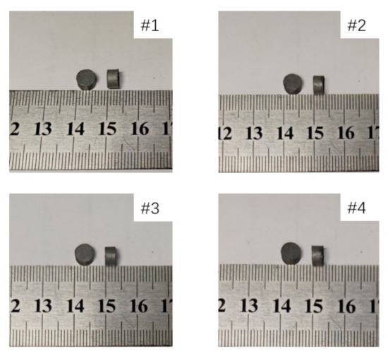 According to the size of the specimen, we weighed 0.21 g of the mixed powder and poured it into a mold with a Φ6 mm hollow cylinder. The powder was pressed at a compressive pressure of 500 MPa for about 1–2 min. Then, the specimens were removed from the mold and placed for about 24 h in an ambient temperature, ambient pressure, and dry environment to release the residual stress.