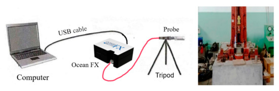 Ocean FX network high-speed spectrometer was used to record the spectrum of the reaction flame of the PTFE/Al/Si/CuO reactive material. An optical probe was aligned with the specimen, the other end of the optical was connected to the spectrometer, and the spectrometer was connected to a computer through a cable. Before the experiment, A halogen lamp was used to calibrate the spectrometer. In the experiment, the spectrometer was triggered to collect signals when releasing the drop hammer. The schematic diagram of the spectrum measurement system is shown in Figure 3. Information about the experimental instrument is shown in Table 4.