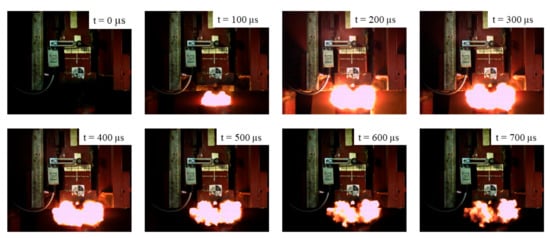 The intensity of the reactive material reaction is proportional to the energy input by the drop hammer. Within a specific range, the higher the drop weight, the longer the reaction time. The ignition heights of the four kinds of specimens were calculated by the relationship between flame duration and drop height. The reaction process of the #1 material is shown in Figure 4 at a drop height of 240 cm.