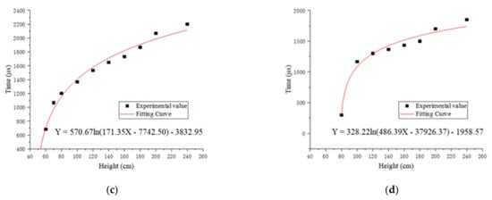 The fitting curves and functions of the relationship between the drop height and flame duration of four specimens: (a) fitting curve and function of #1; (b) fitting curve and function of #2; (c) fitting curve and function of #3; (d) fitting curve and function of #4.