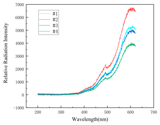 According to the above formula, the flame temperature can be calculated. As shown in Figure 6, flame spectrums of four kinds of specimens were recorded by the spectrum system at a drop height of 200 cm.