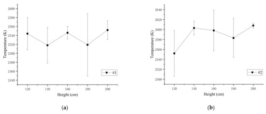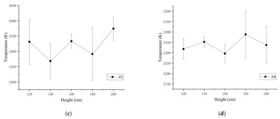 The average flame temperature and standard deviation of the four samples: (a) average temperature and standard deviation of #1; (b) average temperature and standard deviation of #2; (c) average temperature and standard deviation of #3; (d) average temperature and standard deviation of #4.
