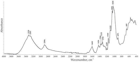 The FTIR spectrum of ARBOCEL® P 4000 X is shown in Figure 1. The wavenumbers of the peaks are summarized in Table 3. The filler FTIR spectrum shows bands typical of cellulose compounds.