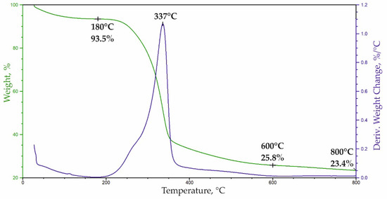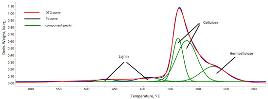 In the second stage of the degradation in the range of 180–600 °C, there was a loss of approx. 67.7% of the mass, which corresponds to the degradation of lignocellulose. After the degradation at 800 °C, approx. 23.4% of ash remained. The course of the lignocellulose degradation is represented by the multiplet peak on the derivate weight (DTG) curve in the range of 180–600 °C with a maximum at 337 °C. To evaluate the composition of lignocel-lulose, this multiplet peak was decomposed into component peaks (Figure 5) using a Gaussian distribution in the OMNIC 8.2.0.387 Thermo Fisher Scientific Inc. software.