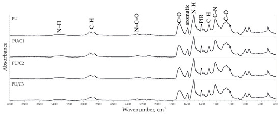 Based on the FTIR spectra, the functional chemical groups of the PUR and PUR composite foams were identified (Figure 6).