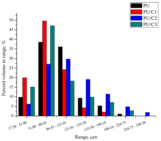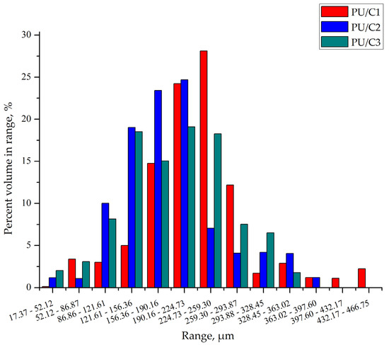 The sizes of the particles contained in the pore walls of the composites differed significantly (Figure 9). In the foam containing 1 php microcellulose, the particles and their agglomerates have sizes in the range of 17–470 µm, and 52% of them have sizes in the range of 190–260 µm. The character of the cellulose particle size distribution in the PU/C2 composite is similar to that of the PU/C1 composite. The largest particles in this foam are in the range of 156–224 µm and their share is approximately 48%. The particle size distribution of the PU/C3 foam is flatter than that of the other foams. In this foam, 71% of the particles are in the range of 120–260 µm.