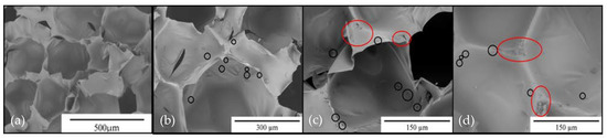 A similar reduction in the size of the foam cells after addition of 1% cellulose (CNC) was observed by Zhou et al. [43].