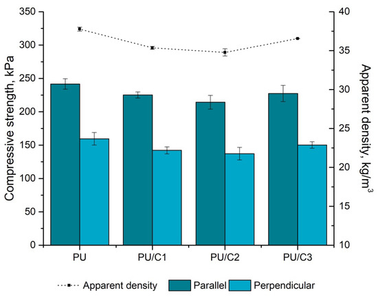 Compressive strength tests of the foams at 10% deformation were performed on a Zwick model Z005 TH Allround-Line (Ulm, Germany)machine at a compression speed of 2 mm/min. The tests were carried out in both directions of the foam growth: parallel and perpendicular. The tests were conducted in accordance with the 826:2013-07standard [35].
