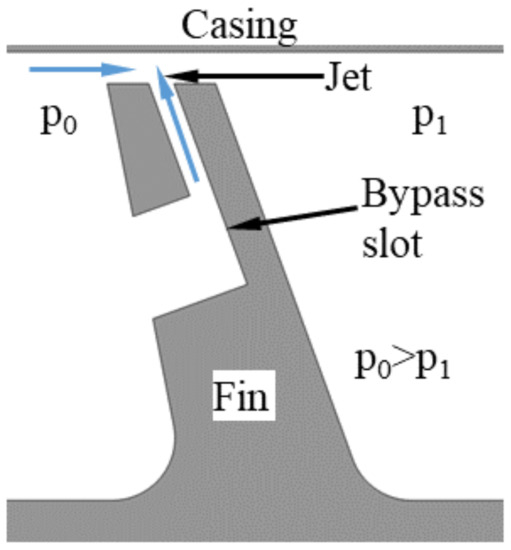 The modification of the labyrinth seal presented in this paper is called the ‘air curtain’, and this modification is proposed in order to improve its effectiveness. The fluidic seal (curtain) is created in the gap between the fins of the seal and the casing by the high-velocity jet present in the bypass slot (Figure 1). The bypass channel connects the upstream face of the fin with the surface of the tip of the fin.