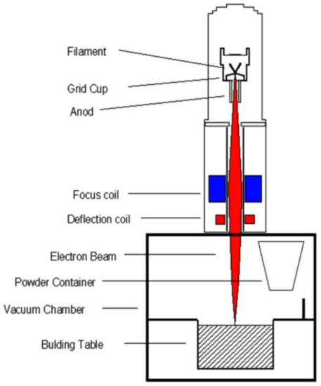 Considering recent trends in additive manufacturing, turbine blades were produced by Electron Beam Melting [27] as schematically presented in Figure 2 [28]. In the EBM machine, patented by the Swedish company Arcam, melting and consolidation of the layers is performed using the energy of an electron beam up to 3 kW. The entire process takes place in a high-vacuum chamber at a pressure below 10−5mbar. Electrons are emitted from a tungsten filament, accelerated through an anode to hit and melt the powder by the transformation of their kinetic energy into heat. The elevated build temperature is above 1000 °C for γ TiAl. Magnetic lenses are used to focus and control the movement of the beam. The build rate is up to 20 mm height per hour [27].