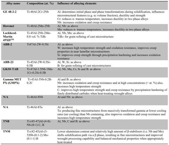 Some commonly used TiAl alloys and the influence of the alloying elements on each of those alloys are summarized in Figure 3 [28].