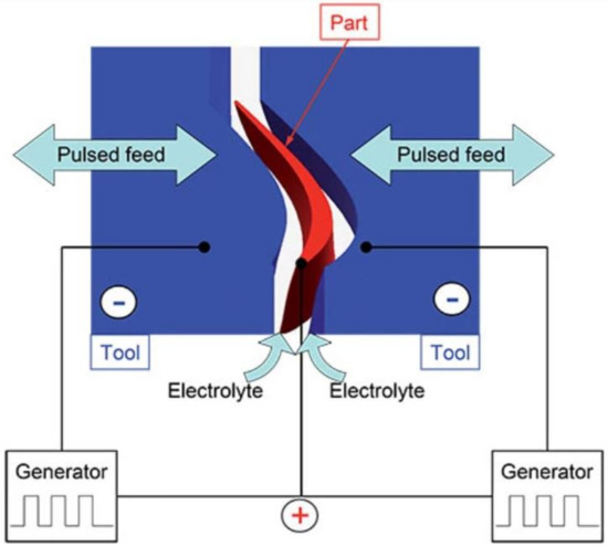 The PECM process for finish-machining blade profiles uses two anode tools that simultaneously machine both sides of a profile using an oscillating motion combined with a pulsed power supply, as shown in Figure 5 [34].