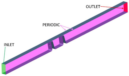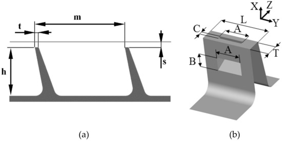The investigated configuration is the seal of the last stage of the LP turbine of an aircraft engine. The geometry of the reference configuration is shown in Figure 7a. The distance between fins m is equal to 23 t, the fin height h = 12.5 t and the gap height s = 0.9 t. The shroud of the turbine blade has a width W equal to 70 t.