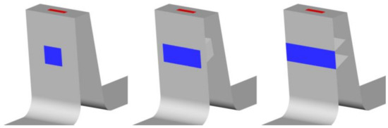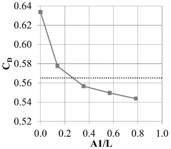 The configuration with an inlet width smaller than the outlet width exhibits a decrease in the jet intensity. The reverse configuration, where the slot inlet is wider than the outlet, was also tested, to see whether it intensifies the jet. The slot outlet width was constant A2 = 0.5 L, and the slot inlet varied from A1 = A2 = 0.5 L to A1 = L (Figure 19).