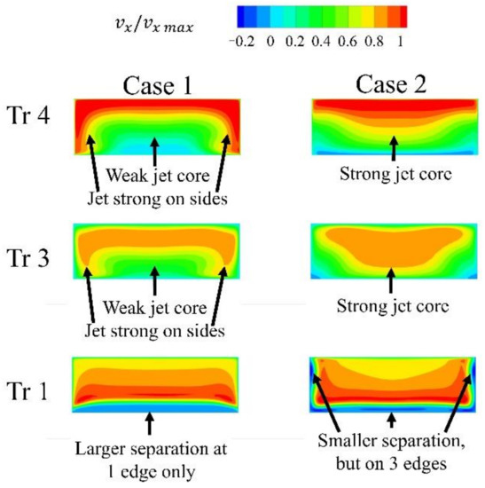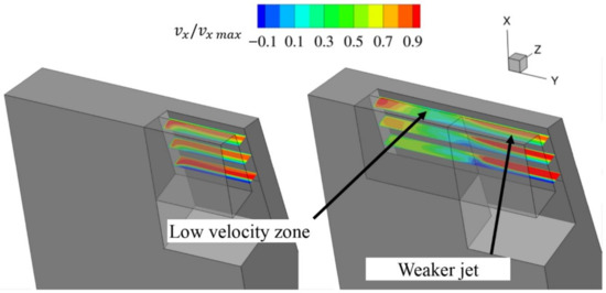 In the case with the wide slot inlet, there is no boundary layer effect at the inlet part of the slot, and the inflow to the outlet part of the slot is significantly altered. This separation occurs at three edges, and the jet core is stronger, although it is less intense at the sides.