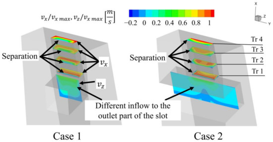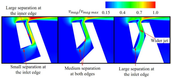 The cases where the slot inlet was wider than the slot outlet were more effective than the case with a constant slot width (Figure 20). The wider the inlet, the smaller the leakage. For the slot with the widest inlet, the leakage reduction was 150% compared to the reference case with constant width. Using a wide inlet fundamentally changes the flow field inside the slot. With a constant slot width, there is a separation at the edge inside the slot (Figure 21 and Figure 22). Due to the separation, the velocity of the jet in the middle, close to the upstream wall, of the outlet of the slot is smaller and the jet is less intense. The velocity at the sides of the slot is quite intense, due to the lesser degree of separation in the proximity of the wall caused by the lower velocity resulting from the boundary layer effect in the inlet part of the slot.