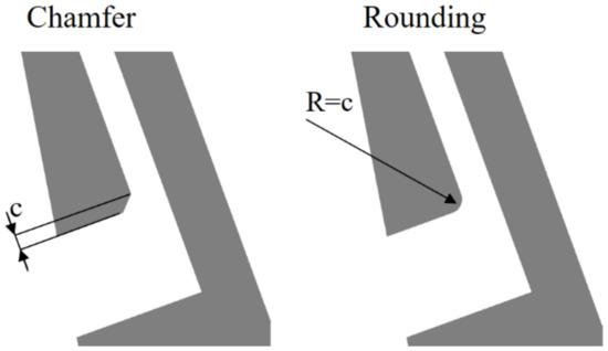 An obvious way to decrease the slot separation is to make the transition from the inlet part of the slot to the outlet part of the slot smoother. This can be done using either rounding or a chamfer on the slot edge. Both of those options were tested with chamfer and a rounding size of c = 0.1 T (Figure 23).