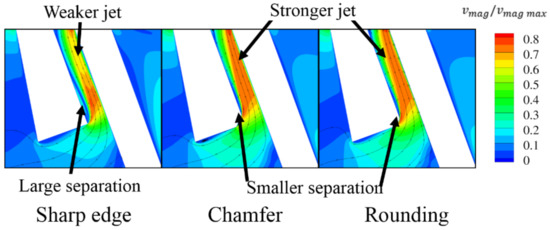 Both configurations show a decrease in the leakage through the slot of about 2% compared to slots with a sharp edge. It can be observed in Figure 24 that the separation inside the slot is limited, and the jet is more intense.