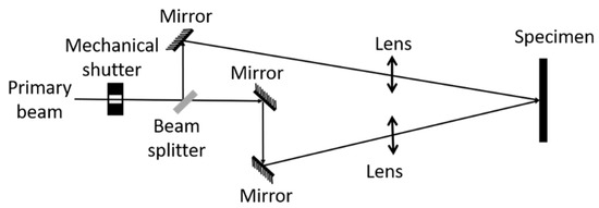 Schematic diagram of the laser-interference system. An angle between the beams of is used in this study.