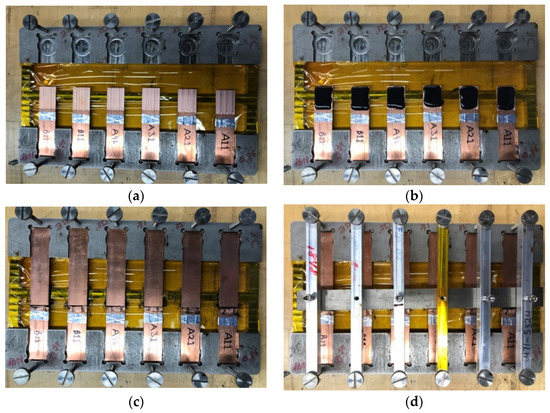 The single-lap shear joints were bonded with specially designed fixtures according to the ASTM D1002-10 standard. The Cu specimens were all cut into 25.4 mm (1 in.) × 95.25 mm (3.75 in.) sizes from the same 110 copper sheet having 1.65 mm (0.065 in.) thickness. The bonding overlap length was controlled to 12.7 mm (0.5 in.), as shown in Figure 3. Two specimens were bonded using a toughened, two-part epoxy structural adhesive (3MTM Scotch-WeldTM Epoxy Adhesive DP420, 3M, Saint Paul, MN, USA). The adhesive bond line thickness was controlled to 0.12 mm, as recommended by the manufacturer, by laying down two fishing lines with a given diameter. The specimen alignment and overlap length were assured by the bonding fixture. The fixture has the capacity to bond eight joint samples at the same time. The first specimen was put in one side of the fixture, as shown in Figure 4a. Adhesive was evenly distributed on the bonding surface with the dispenser specified by the adhesive manufacturer. A picture of the specimens with adhesive on top is shown in Figure 4b. Extra spacers were used to keep the two bonding surfaces parallel to each other. With the spacers in place, specimens were put into the other side of the fixture, as shown in Figure 4c. These second specimens were then compressed firmly onto the adhesive using the aluminum bars on top of each sample with tightening bolts. The whole fixture with samples in place, as shown in Figure 4d, was then left at room temperature for 24 h for curing. The overlap area was approximately 25.4 mm (1 in.) by 12.7 mm (0.5 in.), following the ASTM D1002-10 standard, to ensure the specimens could be pulled apart without breaking the Cu adherents.
