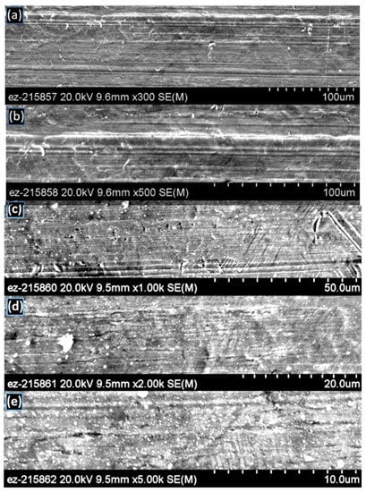 SEM micrographs for the as-received surface are shown at different magnifications in Figure 5. The as-received surface exhibits horizontal rolling marks, many micro-cracks throughout the surface, and other surface defects. Even at a very high magnification at 5000×, the surface appears quite flat.