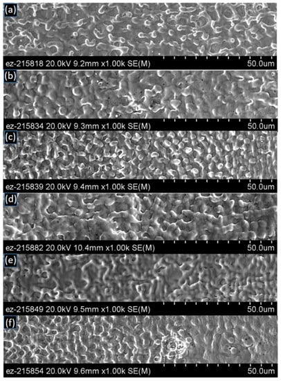 Figure 6 and Figure 7 show the SEM images at 2000× magnification for the laser-interference-processed surface using the spot-by-spot method with 4 mm and 5 mm laser spot sizes, respectively. For the case of a 4 mm spot size, two pulses per spot already provided enough energy to form the finger-like protrusions, filament/network-like patterns that are evidence of widespread melting (Figure 6a). These types of filament/network-like topologies are a result of melting not only at the interference maxima but also at the interference minima. It is likely that the interference profile had a role to play in the formation of this type of fingering. In Table 2, an attempt was made to describe the surface topology qualitatively by indicating the density of geometrical features (i.e., protrusions), their height, and their characteristic size. Further increasing the number of pulses seems to alter the type of net-like geometrical features (Table 2). Larger surface areas are considered to be more beneficial for bonding. Large surface areas would result from taller features and higher density of features per unit surface area. The height and density of these melt-induced features appear to be maximized for two and six shots per spot. For these cases, the accumulated fluences on specimen surfaces were 3.56 J/cm2 and 7.13 J/cm2, respectively. The height and density of these melt-induced features seems to be minimized for specimens with 10 and 12 shots per spot.