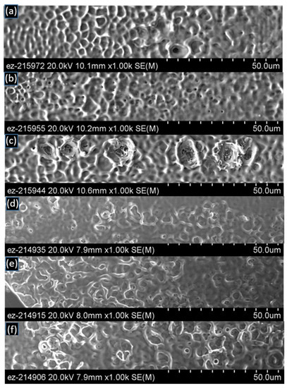 After spot-by-spot processing, the laser raster processing was conducted for only the 5 mm laser spot size. Six different raster speeds were used: 2, 4, 6, 8, 10, and 12 mm/s. In the raster method, a higher speed decreased the overall input energy. The resulting surface topologies are shown in Figure 9 at a SEM magnification of 2000×. At lower raster speeds of 2 and 4 mm/s (Figure 7a,b), the raster method was found to yield similar surface topologies to those from the spot-by-spot method. In Figure 9a, for the lowest speed, the net-like structure could be found in the left side of the SEM with a flatter uniform right side. Crater-like features were evidenced for the 4 mm/s case (Figure 9b), similar to those for the four/six pulses per spot for the spot-by-spot processing (Figure 6c and Figure 8b). As the raster speed was increased from 6 mm/s to 12 mm/s (Figure 9c through Figure 7f), the surface topology became less regular. A summary of surface topologies for the raster technique is presented in Table 4. In general, the surface topology appeared to be flatter than that for the spot-by-spot method with thinner net-like protrusions sticking out of the surface.