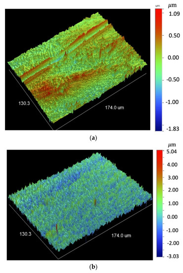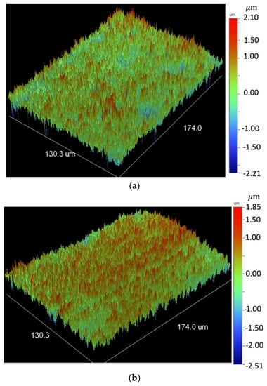 3D surface profile at 50× magnification for laser-interference raster processed with F1 = 2.785 J/cm2 per pulse (5 mm spot size): (a) 2 mm/s and (b) 6 mm/s.
