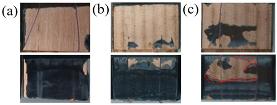 In this section, the results of the adhesive joint shear strength are analyzed and discussed. The failure mechanism can be identified by inspecting the adhesive and adherent surfaces in the overlapping region. Selected photographs of these interfaces are shown in Figure 12. For the cases shown in Figure 12a, most of the adhesive was found attached to one adherent while the other adherent had little trace of the adhesive. This indicates that an ‘adhesive’ failure occurred at the interface between the adherent and adhesive, as opposed to a ‘cohesive’ failure inside the adhesive material itself. In Figure 12b, adhesive remnants can be found on both adherents; however, if matched back together, it is clear that the adhesive left on both surfaces has a small overlapping region. The overlapping fracture layer can be seen as the lighter gray regions outlined in red in the bottom image. This indicates a ‘mixed’ failure of the adhesive, with peeling of the adherents during the test. These adhesive and mixed failure mechanisms are not common for toughened epoxy adhesive and are attributed to the nature of the single-lap joint test. Although the specimens were cut from the same material lot and carefully aligned along the tester axis to reduce the eccentricity of the load path, the high shear force needed to pull apart the specimens still caused out-of-plane bending moments.