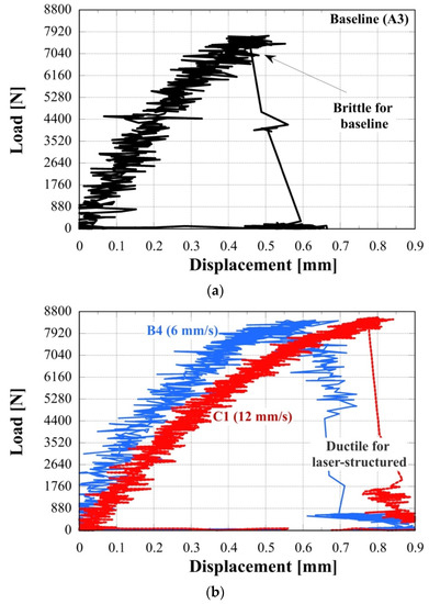 Load versus displacement variation during single-lap shear testing for (a): baseline specimen A3 and (b) laser-structured specimens B4 and C1 (6 and 12 mm/s raster speed, respectively).