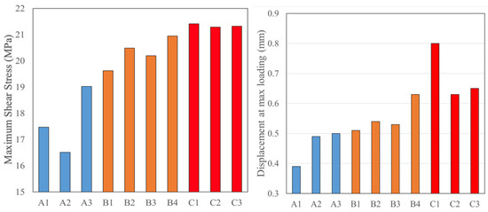 The results of the tensile shear testing are shown in Table 5. The results for specimen C4 exhibit a significant lower maximum loading, shear stress, and maximum displacement than the other samples.