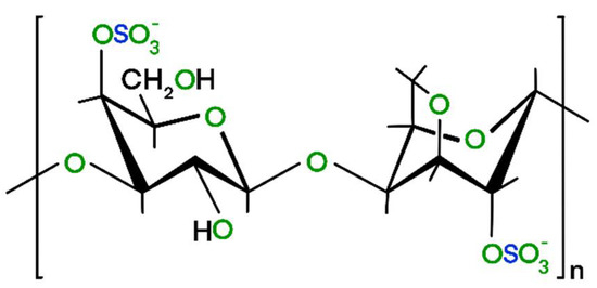 ι-carrageenan powder and urea beads (98%) were bought from Sigma-Aldrich (Budapest, Hungary). The commercial grade, Type II ι-carrageenan precursor contained 4–6% potassium, 2–4% calcium, and 1–2% sodium. The cryogel samples were synthetized according to the method of Li et al. [30]. Briefly, 4 g urea was dissolved in 200 mL of distilled water and warmed to 80 °C. 4 g of ι-carrageenan was added to the solution and stirred for 1 h. ι-carrageenan contains about 28 to 30% ester sulfate and its 3,6-anhydro-galactose content is 25–30% (Figure 1). Due to its strongly anionic half-ester sulfate groups it readily formed a hydrogel in the presence of the potassium and calcium ions. After freeze drying, the dry polymer aerogel (PA) was obtained with a yield of 93%.