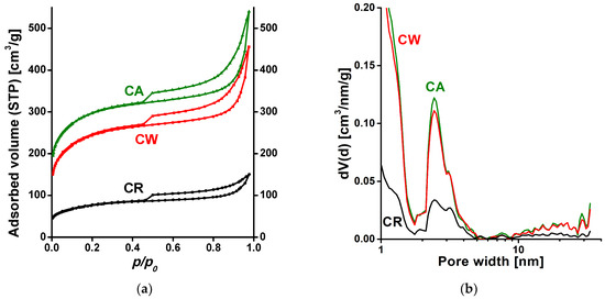 The shape and the type of the hysteresis loop imply that the samples contain micro-, meso- and macropores that form an interconnected network. As the macropores are not completely filled with pore condensate, the total pore volume of the samples cannot be deduced from the nitrogen adsorption isotherms, instead, we estimated the liquid equivalent V0.98 of the gas adsorbed at p/p0 = 0.98. The development of the carbon texture during the synthesis steps is simultaneously revealed by the upward shift of the three isotherms, the pore size distribution curves (Figure 2b) and the XRD signals shown in the Supplementary Material Figure S2. The enhancement between CR and CW is related to the removal of inorganic minerals that survive the pyrolysis step, while the moderate shift from CW to CA results from the consecutive thermal treatment. The data deduced from the isotherms are shown in Table 1.