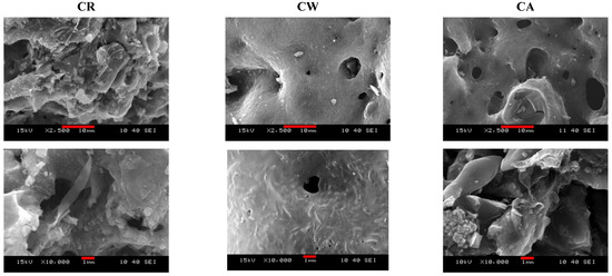 SEM images of carbon aerogel samples CR, CW, and CA. The scale bars are 10 and 1 μm in the upper and lower raw, respectively.