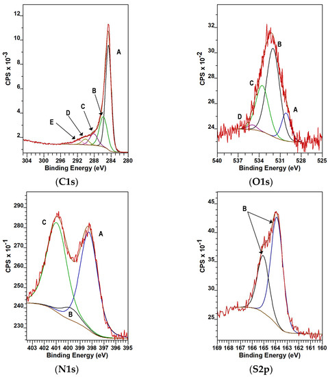 The C1s, O1s, N1s and S2s regions of the XPS spectrum of the CA sample are shown in Figure 4. (Figure S5 shows the corresponding regions of the intermediate samples.) Although EDS is intrinsically less sensitive to low atomic number elements, the discrepancy between the EDS and XPS data (Table 2) indicates an inhomogeneous distribution of the nitrogen and sulfur. The concentrations of the metal impurities, Na, K and Ca, are below the detection limit of XPS, thus confirming the observations of the above mentioned methods.
