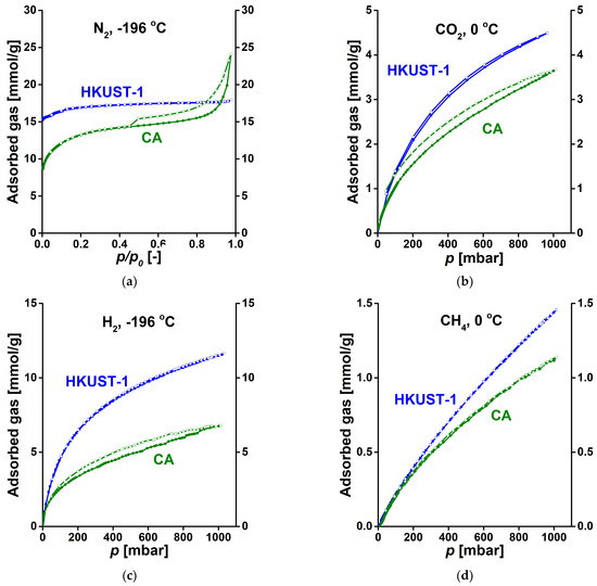 Comparison of adsorption isotherms of CA and HKUST-1 measured with (a) nitrogen, (b) carbon dioxide; (c) hydrogen; (d) methane.
