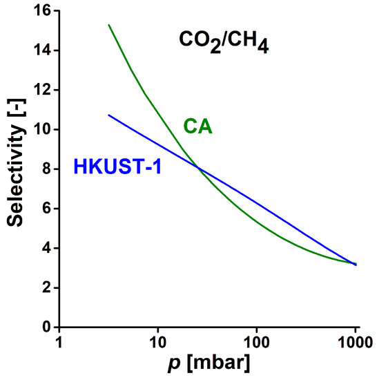 The selectivity of HKUST-1 in this representation displays a linear decrease. Increasing pressure also reduces the selectivity of CA monotonically, but in a more complex way. Below ca 20 bar the estimated selectivity of the carbon significantly exceeds that of the HKUST-1, then up to the upper limit of the pressure range investigated the MOF performs slightly better. That is in good agreement with the ratio of the Henry constants. This finding indicates that CA has potential applications in the separation of CO2 and methane from biogas.
