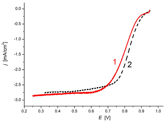 The oxygen reduction reaction in aqueous media occurs mainly through two different pathways. The four-electron reduction pathway transforms O2 directly to H2O. The other route is a two-electron pathway through peroxide formation [67]. In polymer electrolyte membrane fuel cells (PEMFCs) the preferred ORR pathway is a four-electron transfer. Depending on the pH of the reaction media the 4e− reduction route has different thermodynamic potentials ranging from 0.401 V in alkaline media (Equation (4)) to 1.230 V in acidic media (Equation (5)) [67,68]: