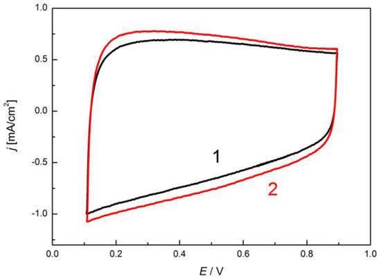 Cyclic voltammogram of a freshly prepared electrode in 0.1 M KOH (1), and after 500 cycles between potential limits 0.1 and 0.9 V (2).